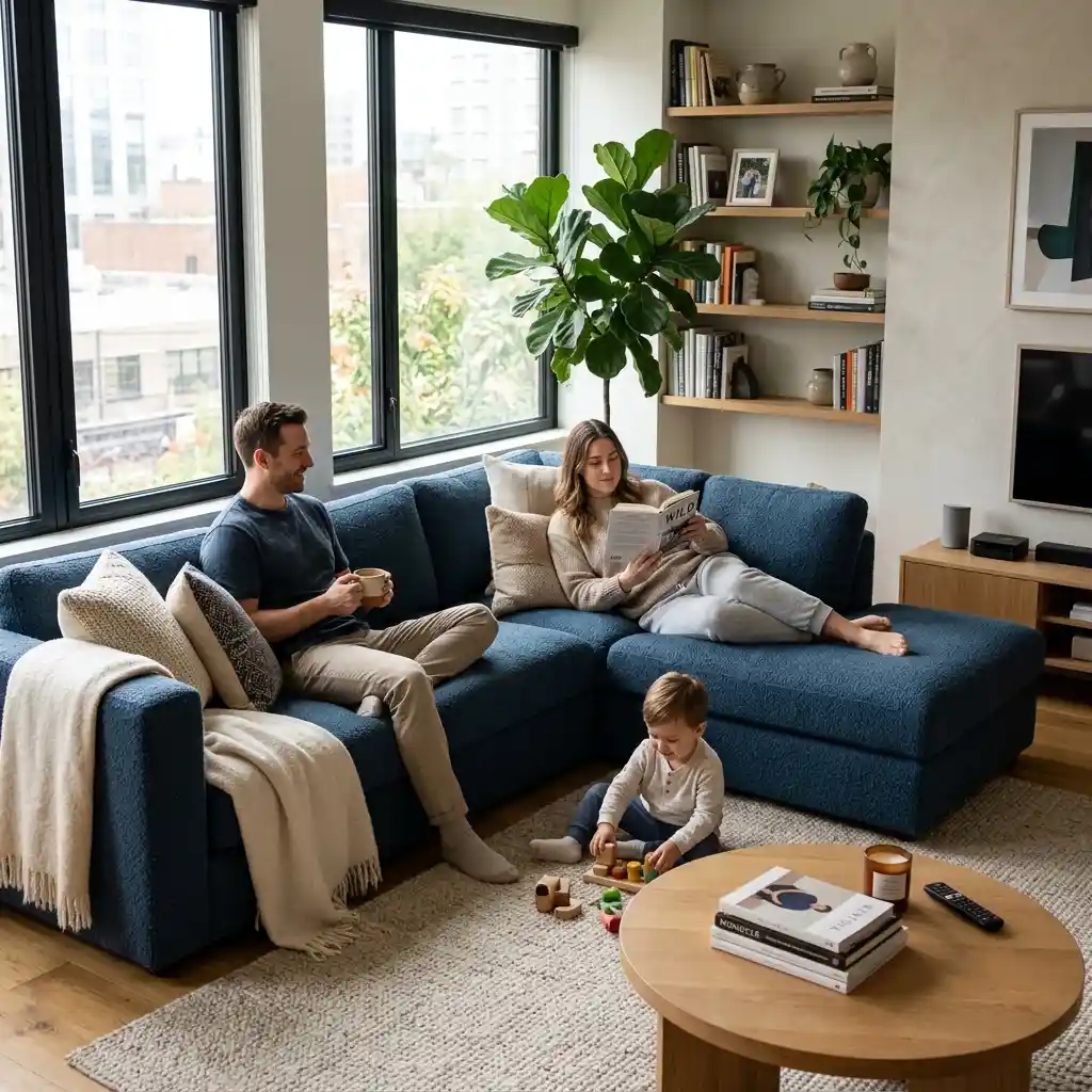 Just make sure the coffee table is reachable from every seat so nobody has to play “pass the coaster.”