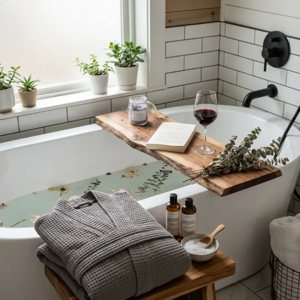 - Add a waterproof bathtub caddy to hold her book (and her wine).