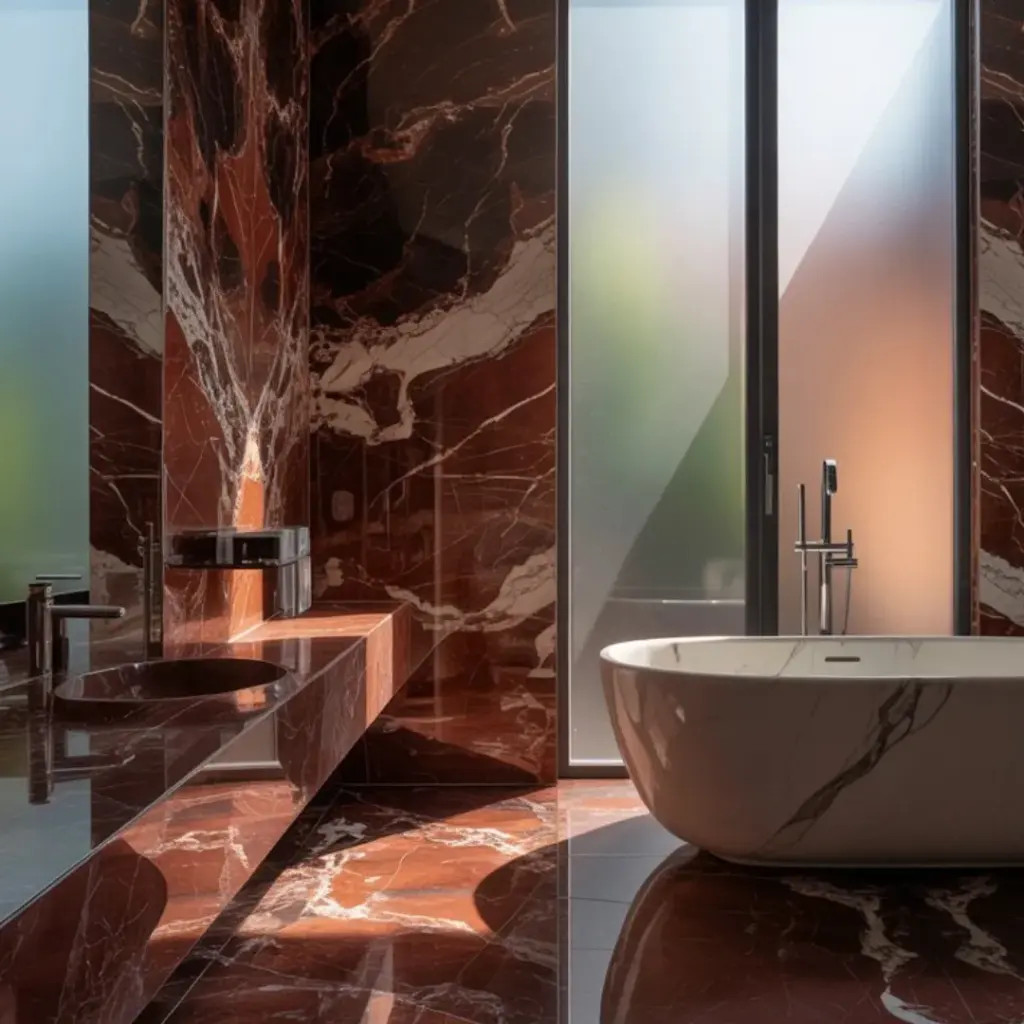 Red marble thrives under the right light. Use warm LED backlighting or dimmable sconces to bring out the depth of the stone.