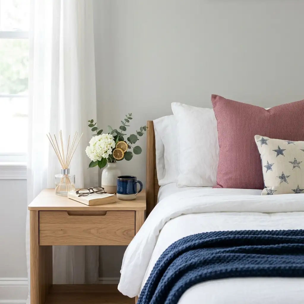 I keep a snake plant or some fresh eucalyptus on my nightstand to soften the patriotic palette.