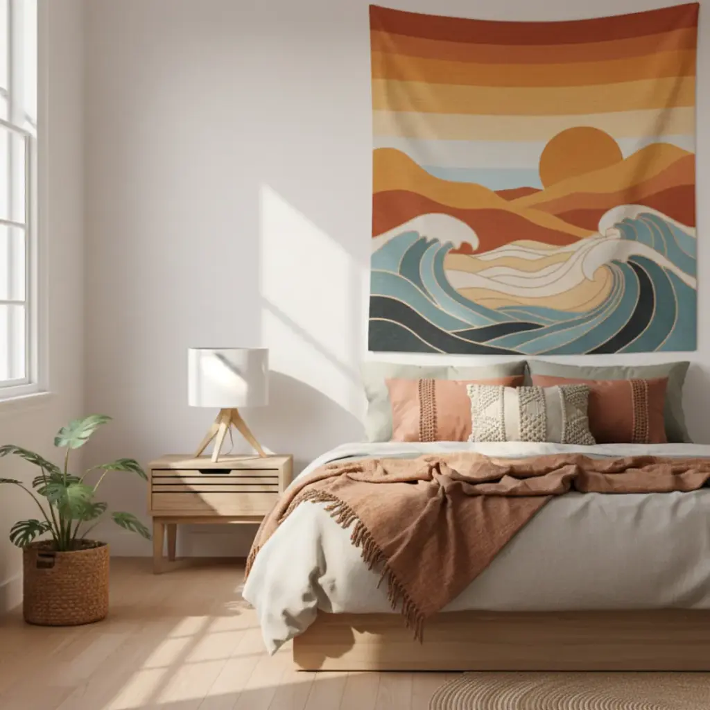 You know what instantly transforms a boring wall into a “wow” moment? A bold boho tapestry.