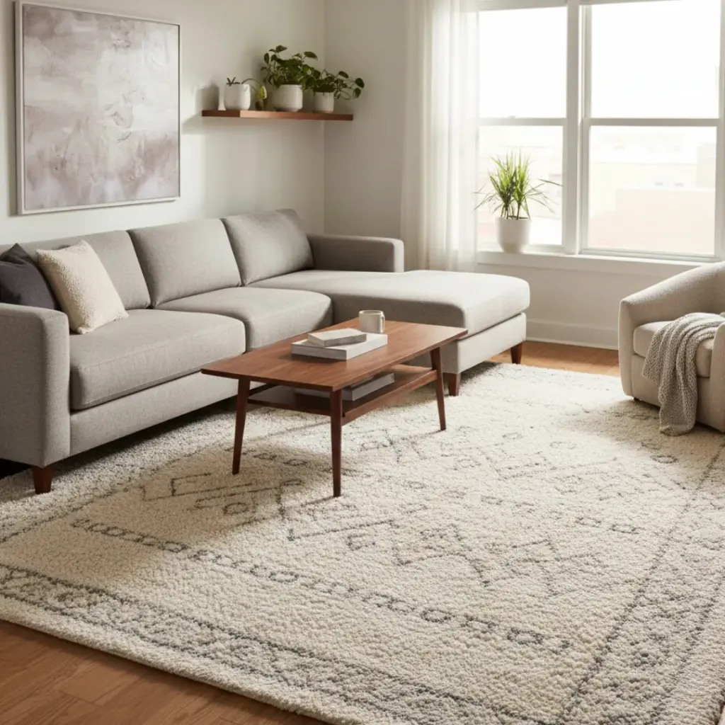 A large, plush rug acts as an anchor that defines the living area in an open-concept layout.