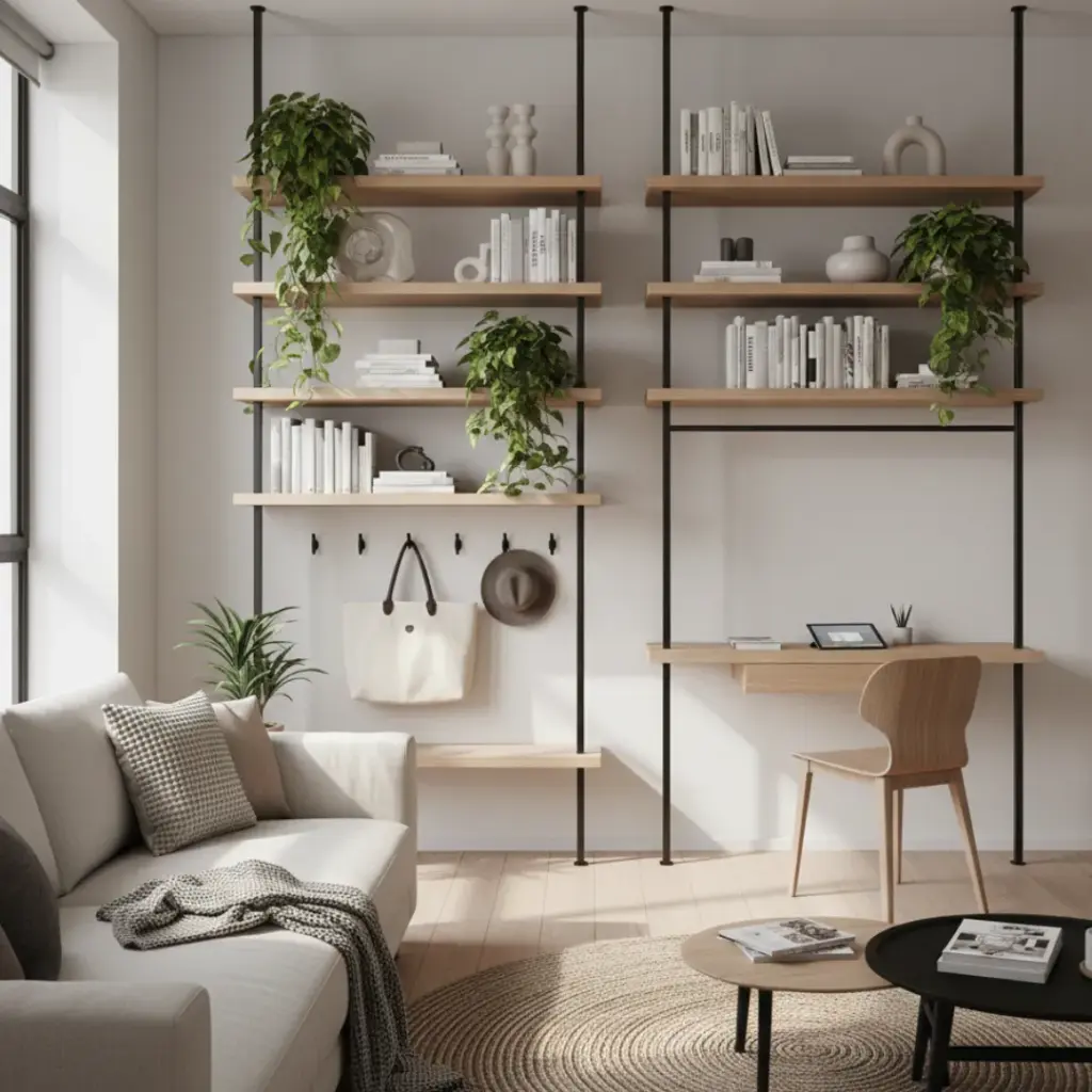 • Wall-mounted hooks for bags or hats.