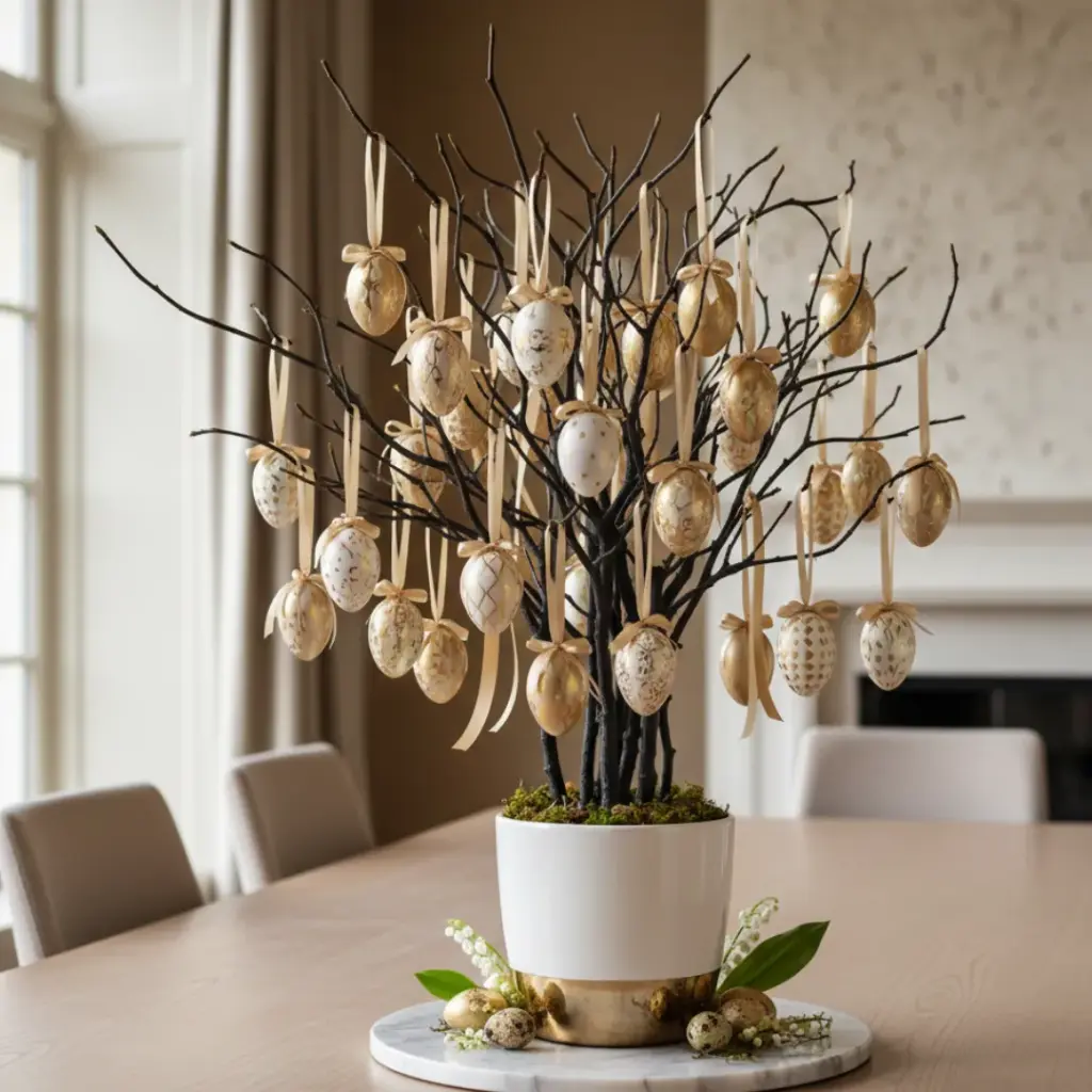 I’m talking bare branches in a glossy ceramic pot, dripping with hand-painted gold leaf eggs.
