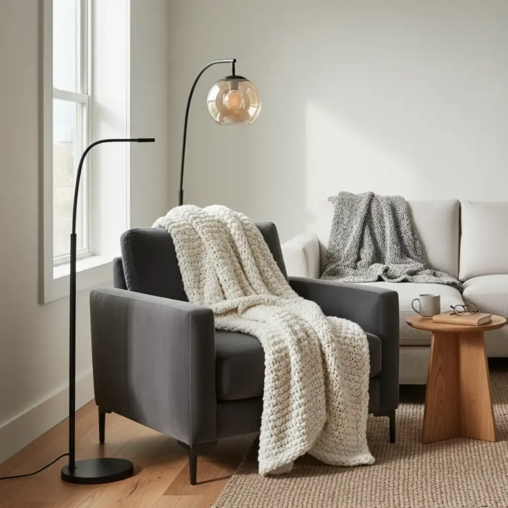 I drape a thick, heavy throw over a deep armchair and pair it with a small side table and a floor lamp.