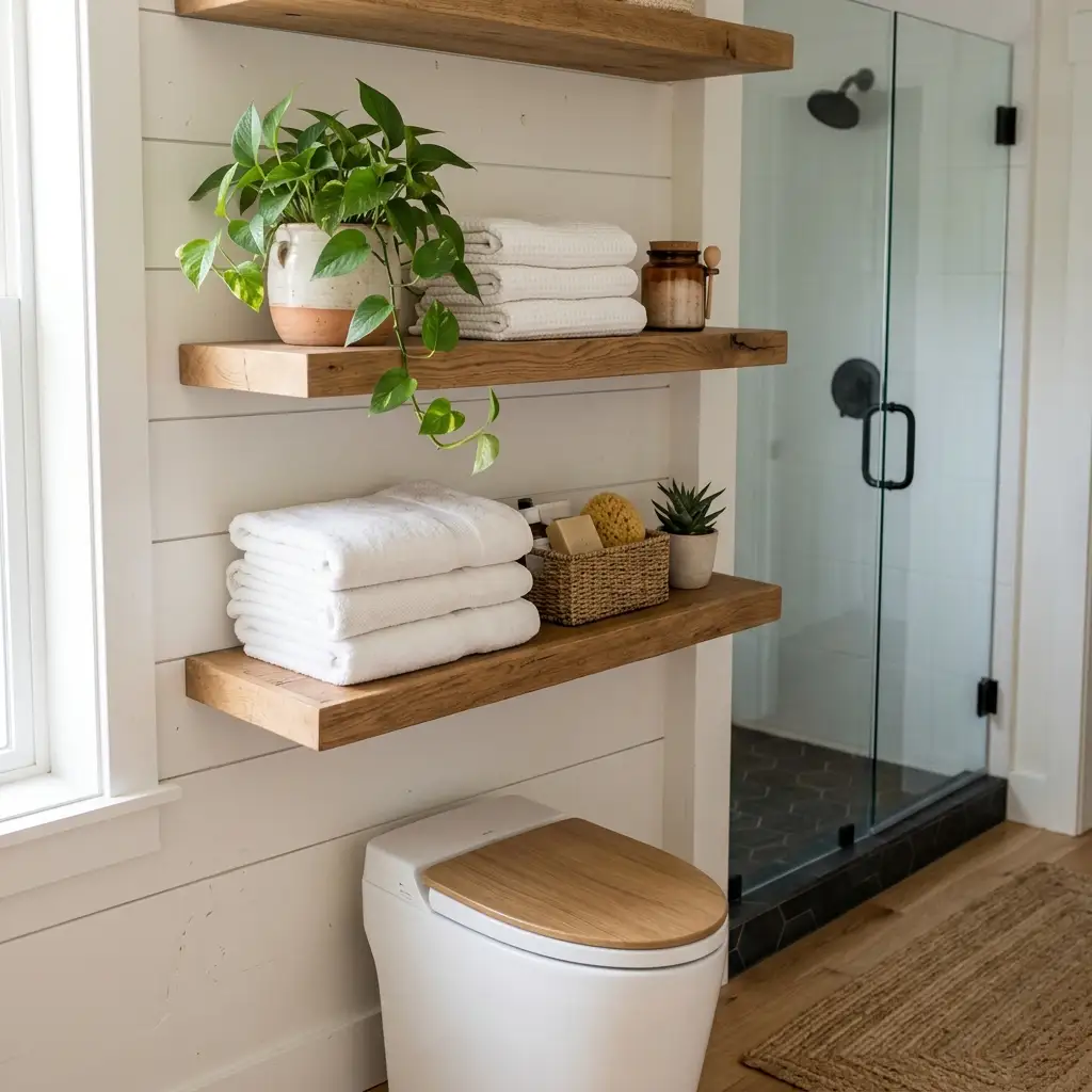 Floating thick wood shelves over the toilet or next to the shower provides storage without the bulk.