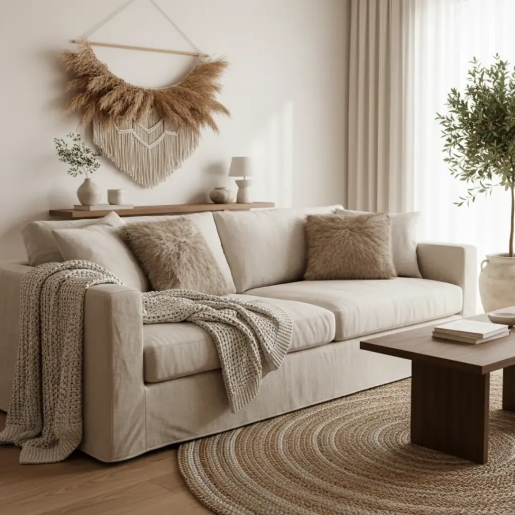 Think about incorporating a jute rug or a linen sofa.