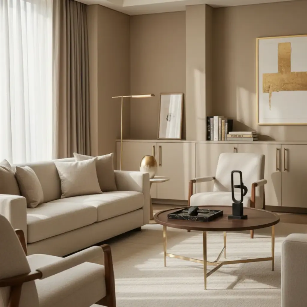 A few brushed brass or matte black accents provide a necessary contrast to soft tan walls.