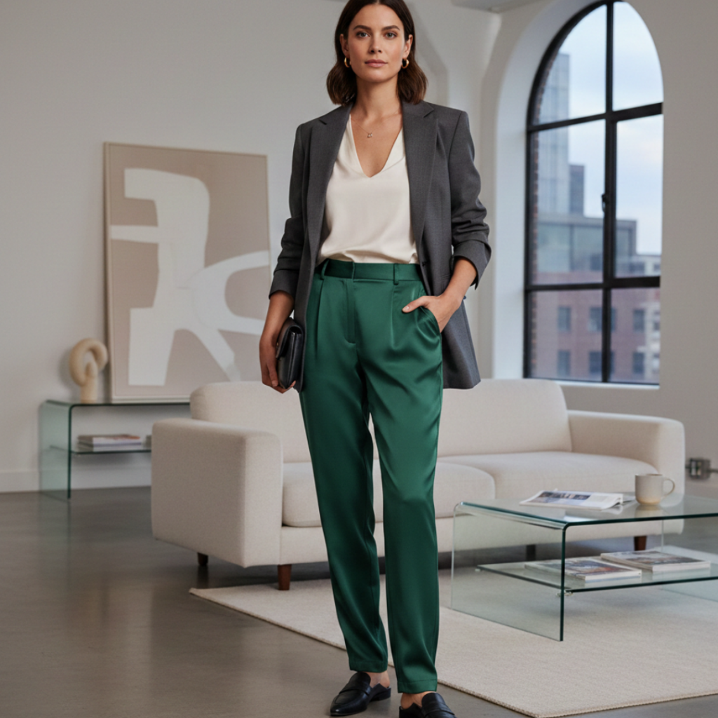 For the Office: Take the Darted Satin Trouser and pair it with the Asymmetric White Shirt. Throw the Butter Yellow Blazer on top. You look professional, but the satin texture adds a little “I have a life outside this cubicle” flair.