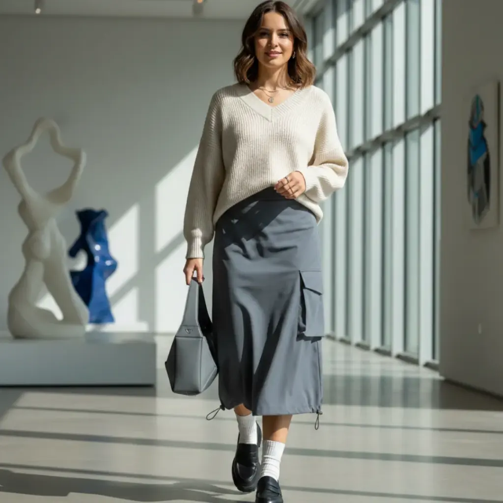 Here is where the “Tech” influence really shines. We’re swapping flowy boho skirts for structured midi skirts made of nylon or recycled polyester blends. They have a slight sheen, hold their shape, and often feature utilitarian details like pockets or toggles. It’s sporty but chic. Pair this with your V-neck knit for a texture clash that screams 2026.