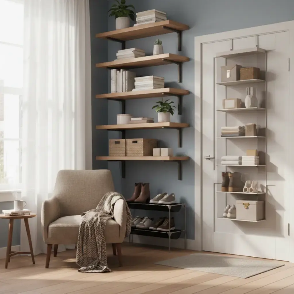 Install floating shelves or over-the-door organizers to get items off the floor.