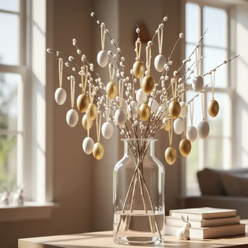 Egg trees can look a bit “kindergarten classroom” if you aren’t careful. I prefer using bleached branches or pussy willow stems in a tall glass vase. I hang monochrome eggs—think all white or all gold—to keep things classy.