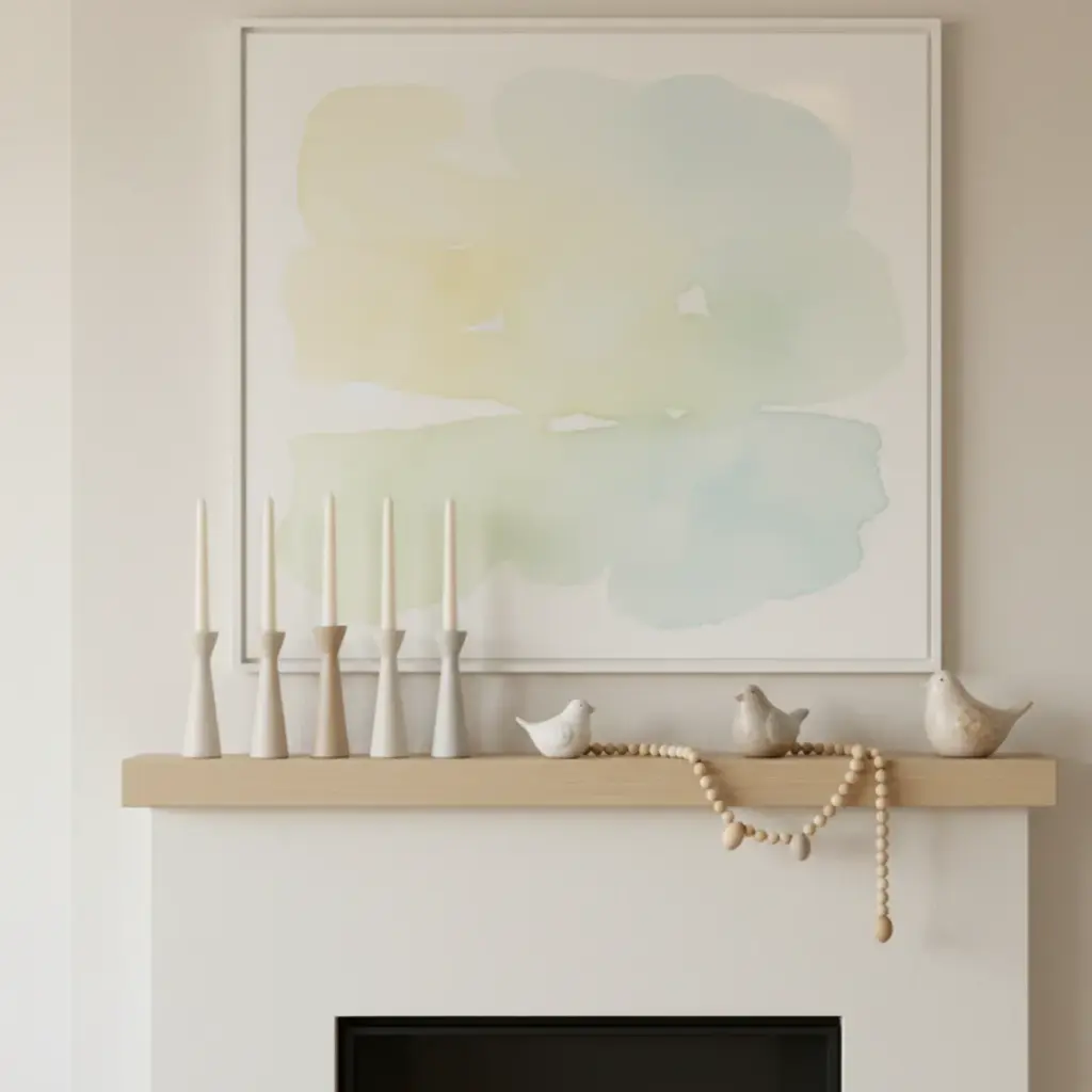 You don’t need to cover every square inch of your fireplace in fluff. I love a “less is more” approach using staggered candlesticks and a few ceramic birds.