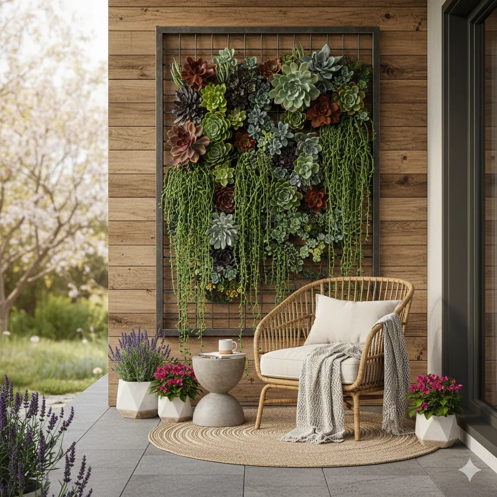 A vertical frame filled with succulents and “String of Pearls” adds a modern, architectural touch.
