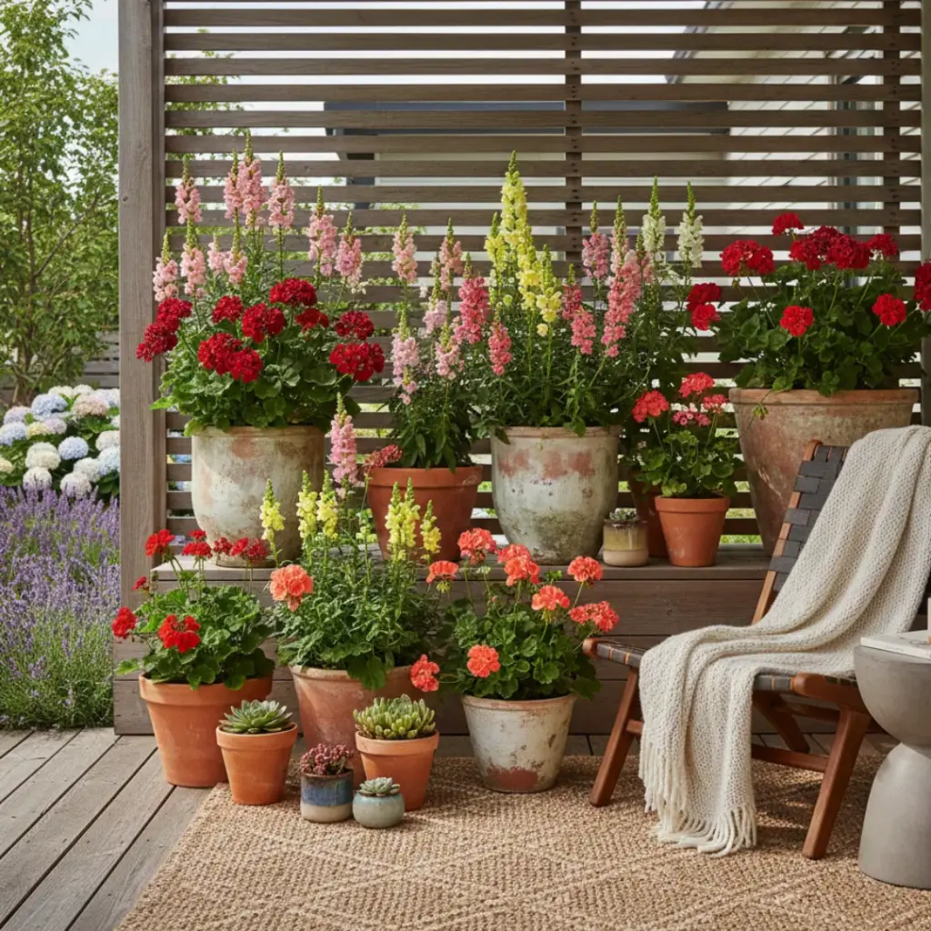 A cluster of different-sized terra cotta pots filled with Geraniums and Snapdragon creates a lived-in, cozy feel. It’s the “boho-chic” look of the gardening world.