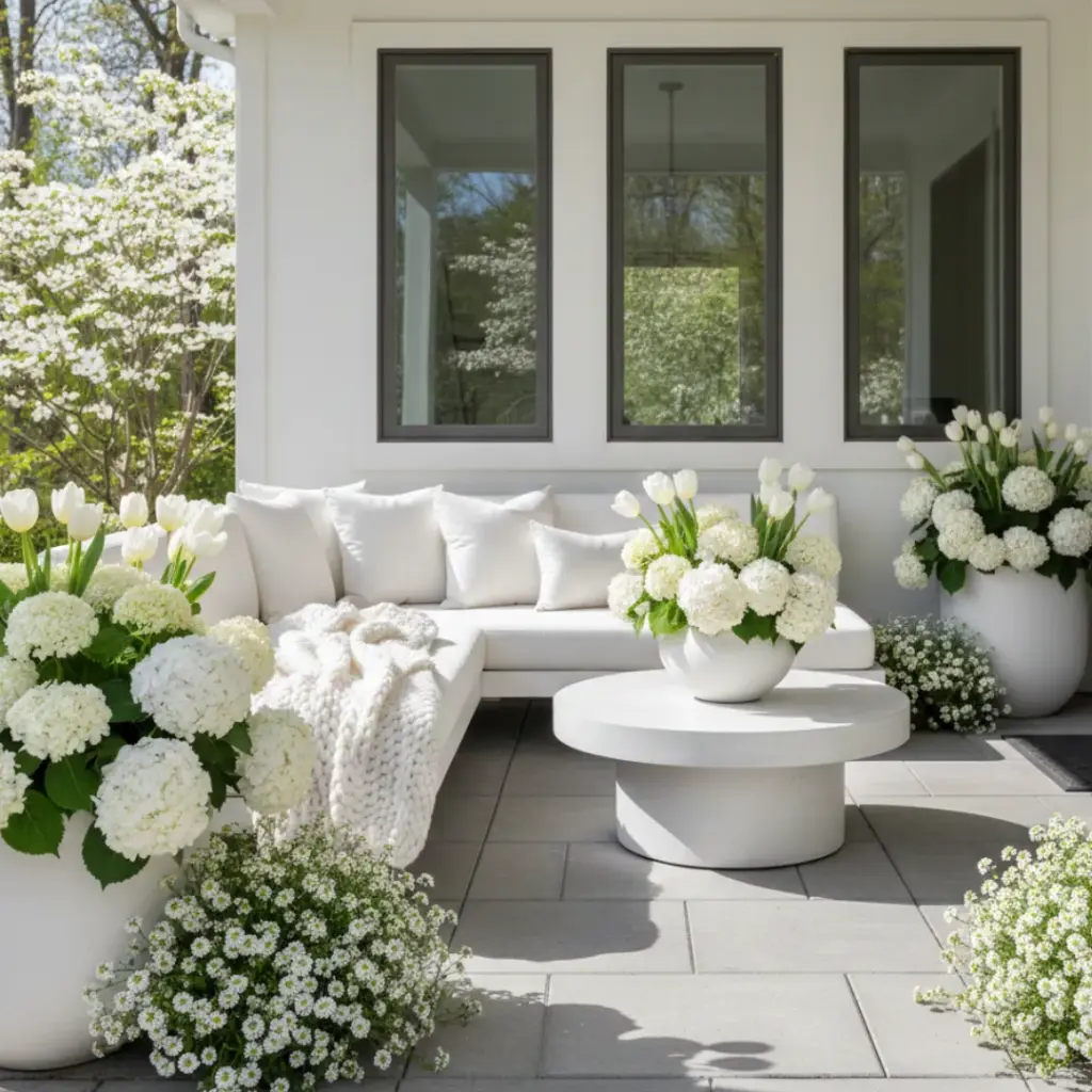 Combine white hydrangeas, Alyssum, and white tulips for a crisp, clean aesthetic. It’s like a fresh coat of paint for your exterior.