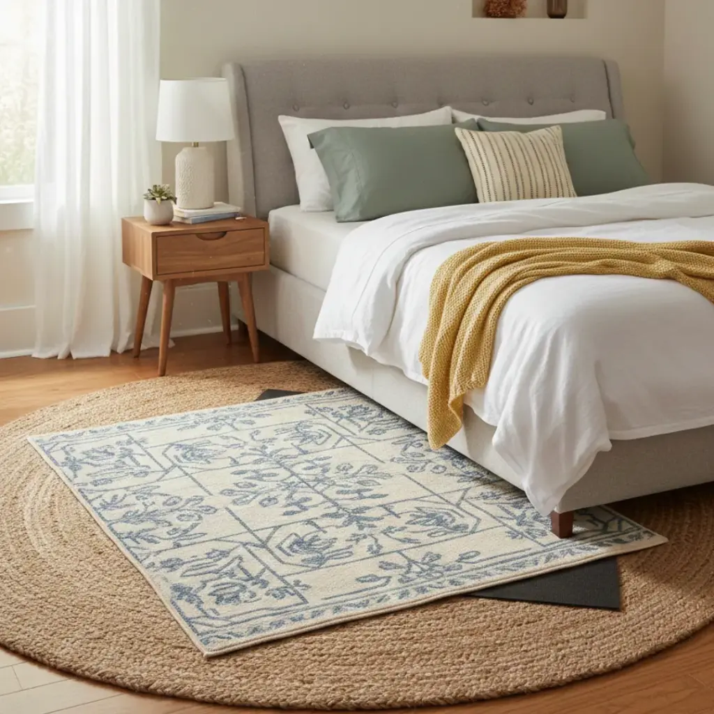 If your floors feel a bit bare but you aren’t ready for a massive shag rug, try layering a jute rug under a smaller, patterned one.